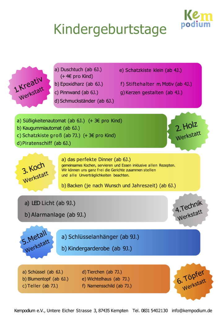 Bei uns erleben die Kinder einen einzigartigen und außergewöhnlichen Kunst- und Werkgeburtstag mit einem individuell abgestimmten Programm, das durch einen persönlichen Fachberater betreut wird.